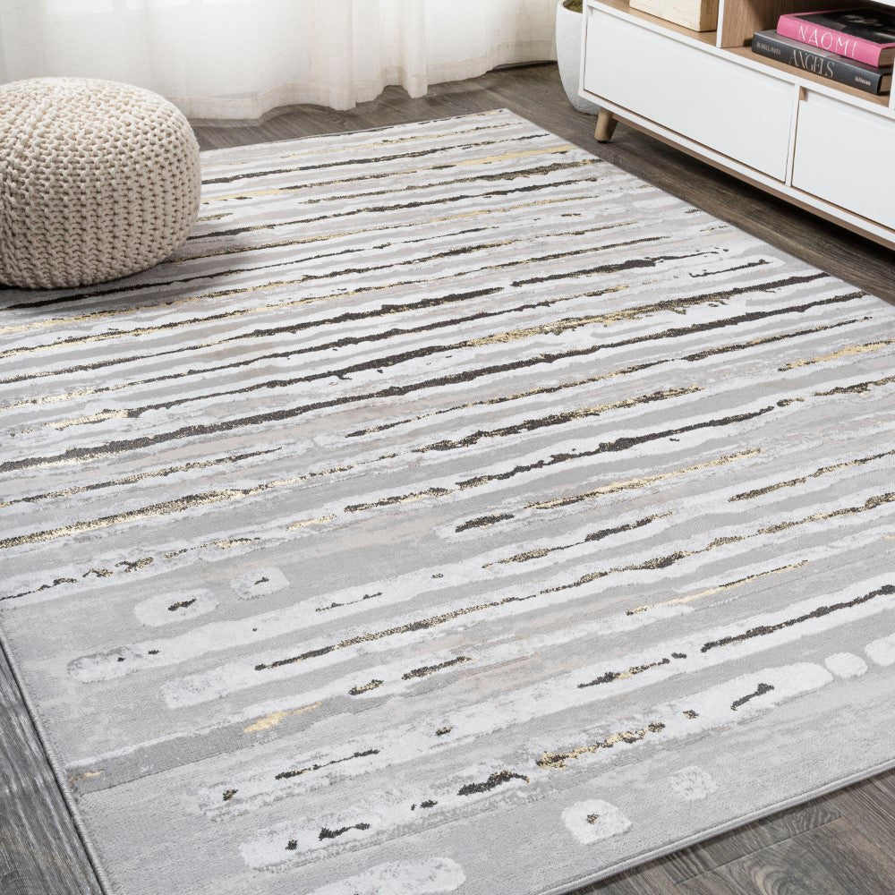 Mingled threads of turquoise, gray and ivory create a modern, abstract linear design with a mid-century look. This rug's unique strie' stripe pattern makes it perfect for homes with kids and pets. It's the ideal centerpiece for a contemporary, coastal or minimalist interior.