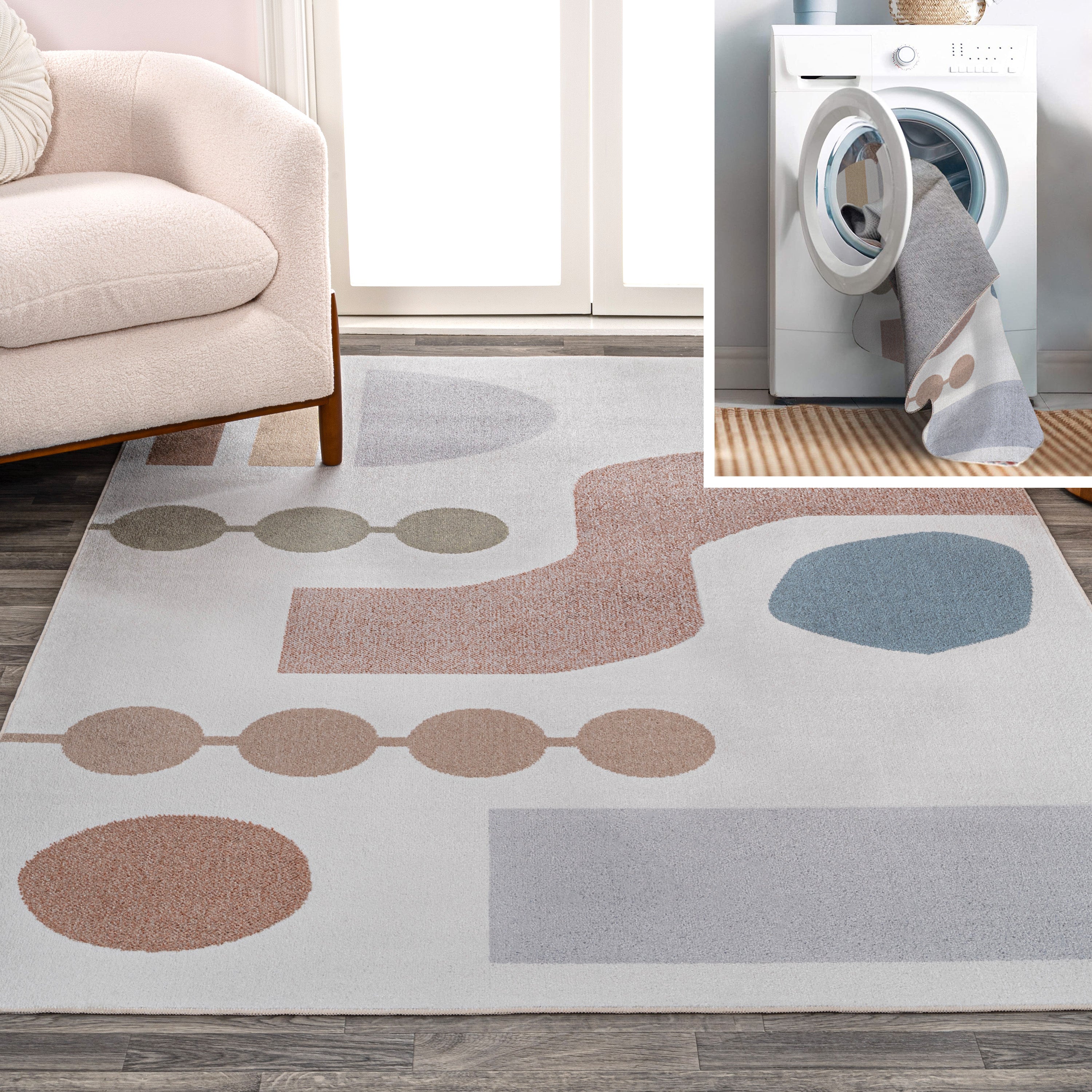 This kid-friendly, washable rug features a modern color palette and abstract shapes. With its contemporary pattern, our rug is ideal for any kids room, family room, or playroom. The pet-friendly synthetic fibers are easy to clean, making this rug the perfect choice for busy families.